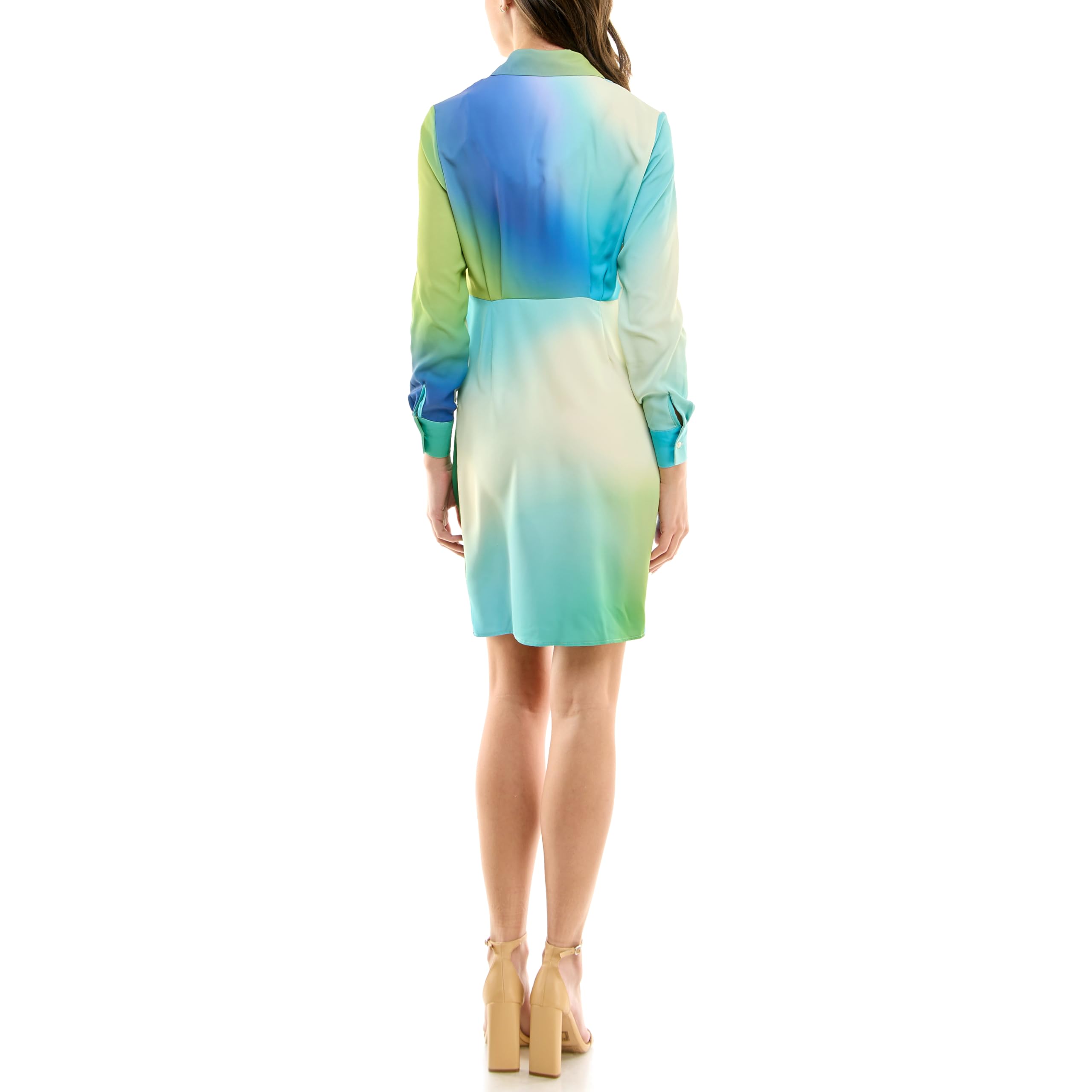 Description:This mini dress features a fresh ombre color design in shades of green, blue, and soft ivory for a modern and eye-catching look. The collared neckline gives it a polished shirt-dress feel, while the twist-front detail adds shape and visual interest at the waist. Designed with long sleeves and a softly draped skirt, this dress looks elegant, stylish, and flattering for parties, vacations, brunch, and special daytime outings.