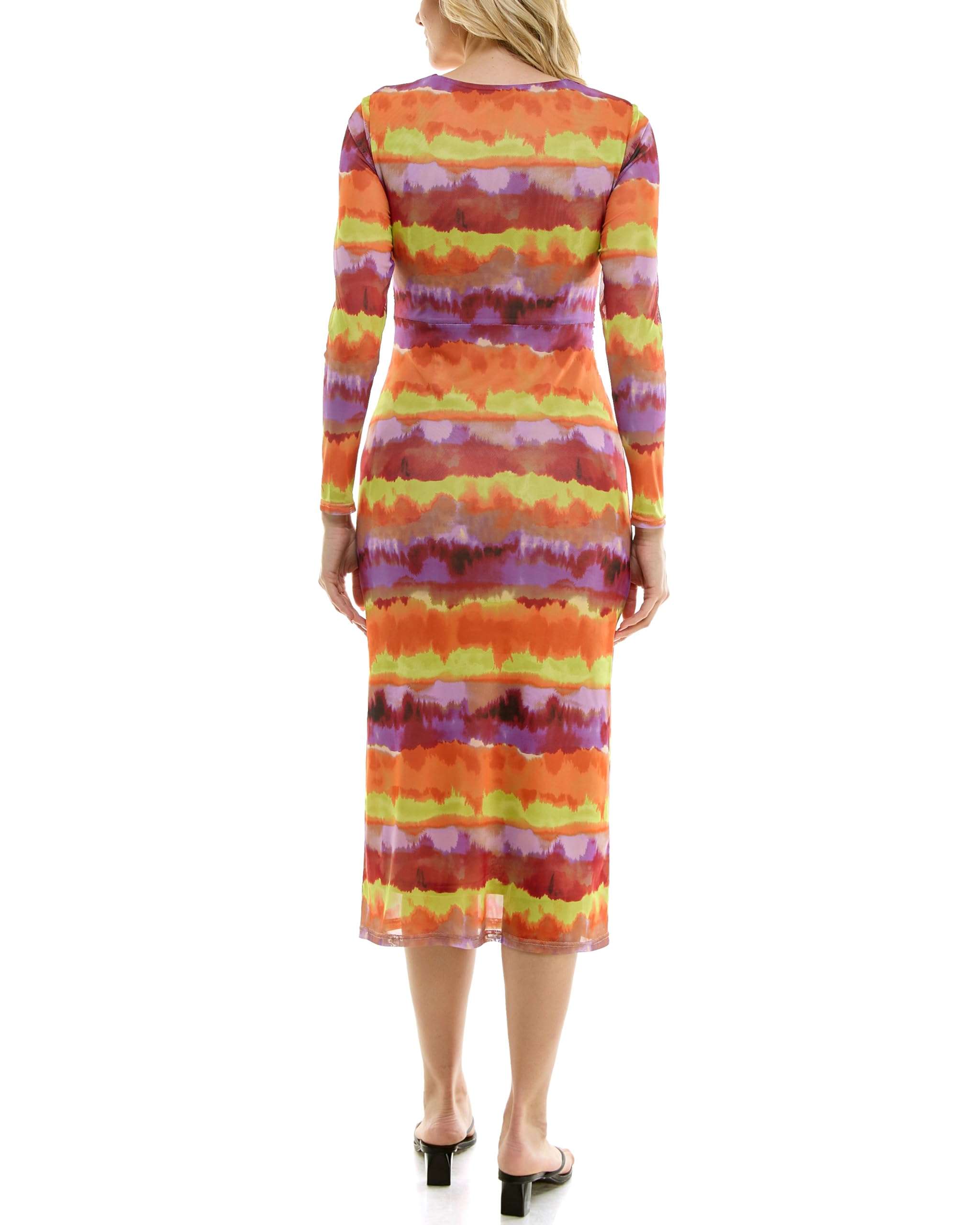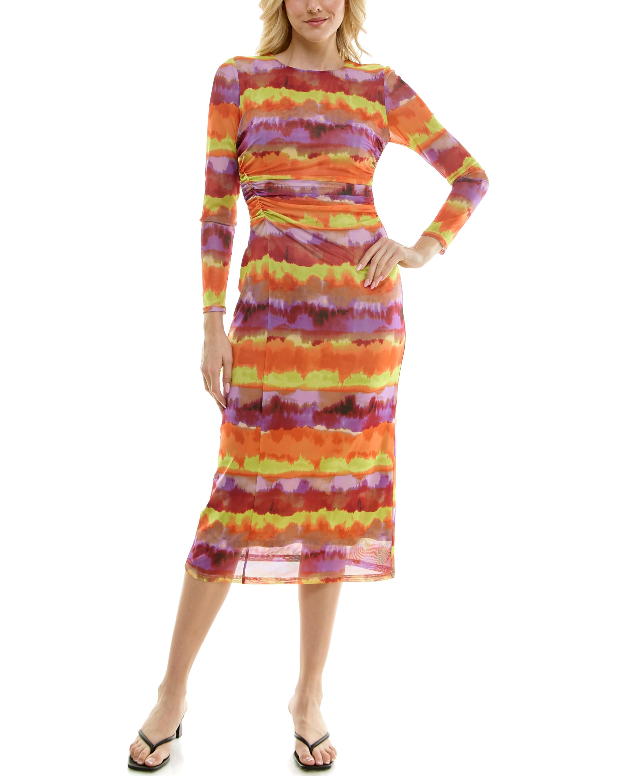 This eye-catching midi dress features a vibrant multicolor abstract stripe print in warm shades of orange, pink, yellow, and purple for a bold and artistic look. The round neckline keeps the silhouette clean, while the ruched waist detail helps shape the figure in a flattering way. Designed with long sleeves and a fitted midi-length silhouette, this dress offers a sleek, modern style that works beautifully for parties, vacations, dinners, and special occasions.