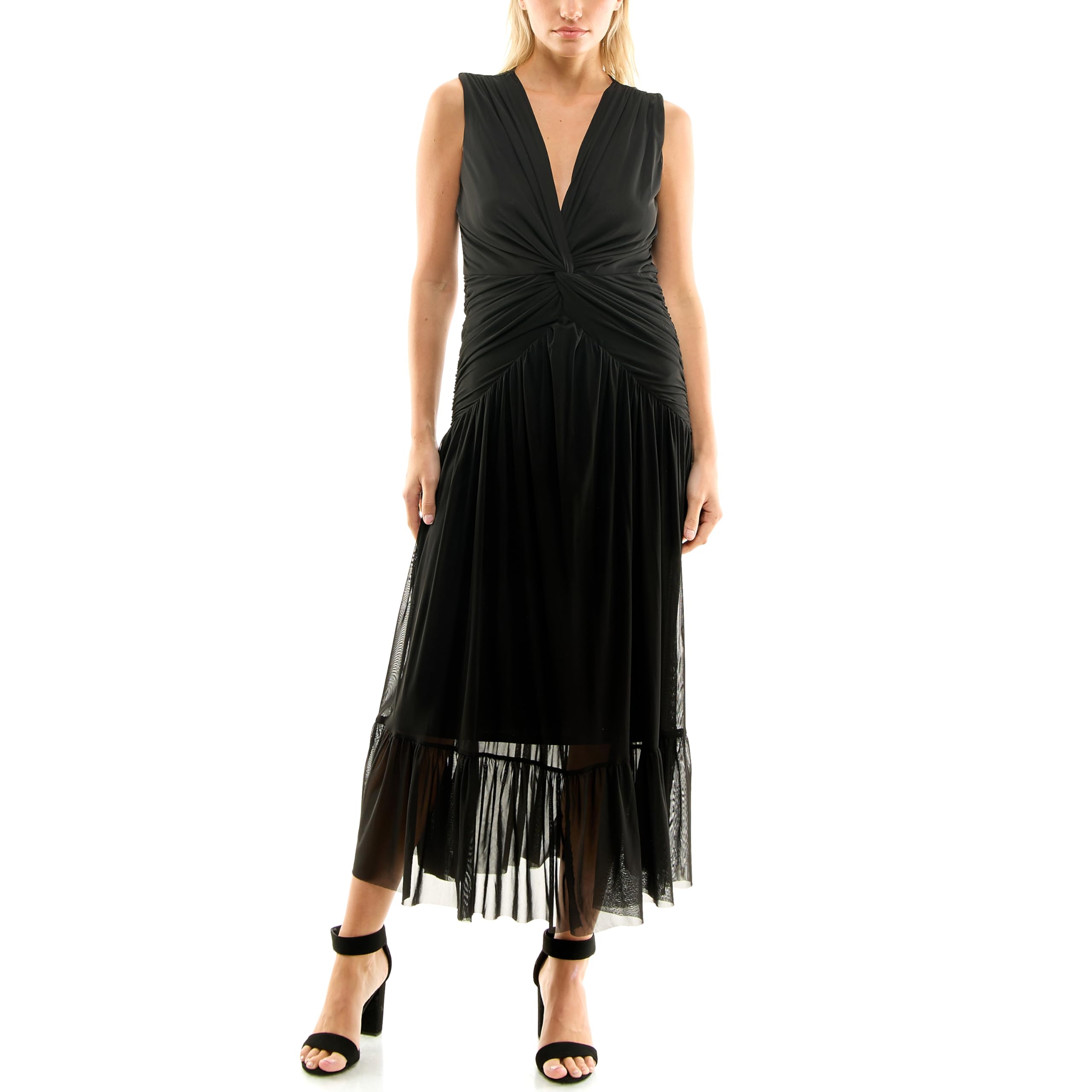 Details:The classic black color gives this dress a timeless and versatile look that is easy to style for different events. The sleeveless design keeps the silhouette clean and modern, while the V-neckline adds a flattering and elegant touch. The twist-front detail creates visual interest across the bodice and helps shape the waist in a soft, feminine way. Gentle gathering through the front adds texture and gives the dress a more sculpted appearance. The skirt falls into a graceful midi length with a light, flowing sh...