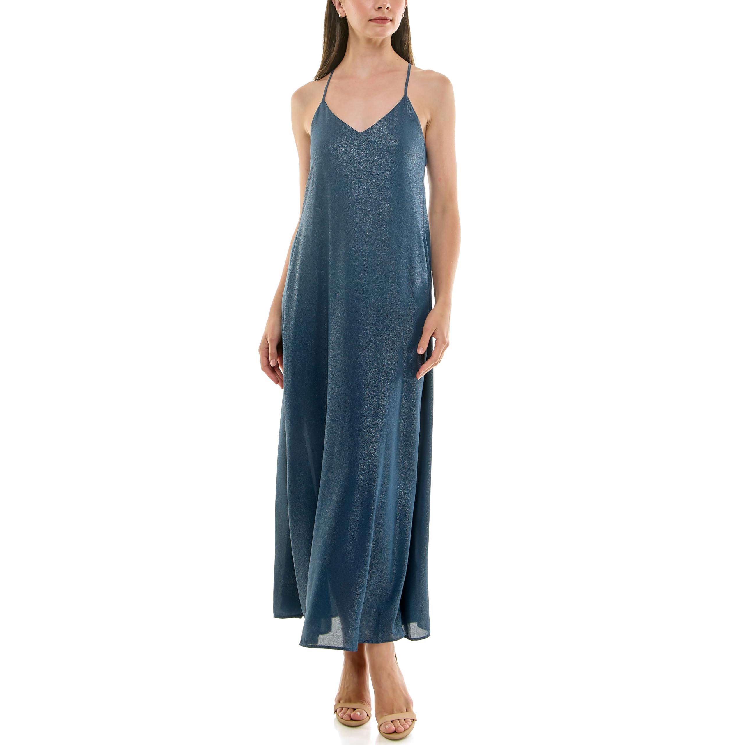 Details:The dusty blue color gives this dress a calm and sophisticated appearance that feels both modern and timeless. A delicate shimmer texture adds soft sparkle throughout the fabric, making the dress look more polished and eye-catching. The V-neck design flatters the neckline, while the spaghetti straps keep the look light and elegant. The loose, flowing silhouette offers comfort and graceful movement, creating an easy yet elevated style. The maxi length adds a long, elongating effect and makes the dress suitable for both casual dressy wear and special...